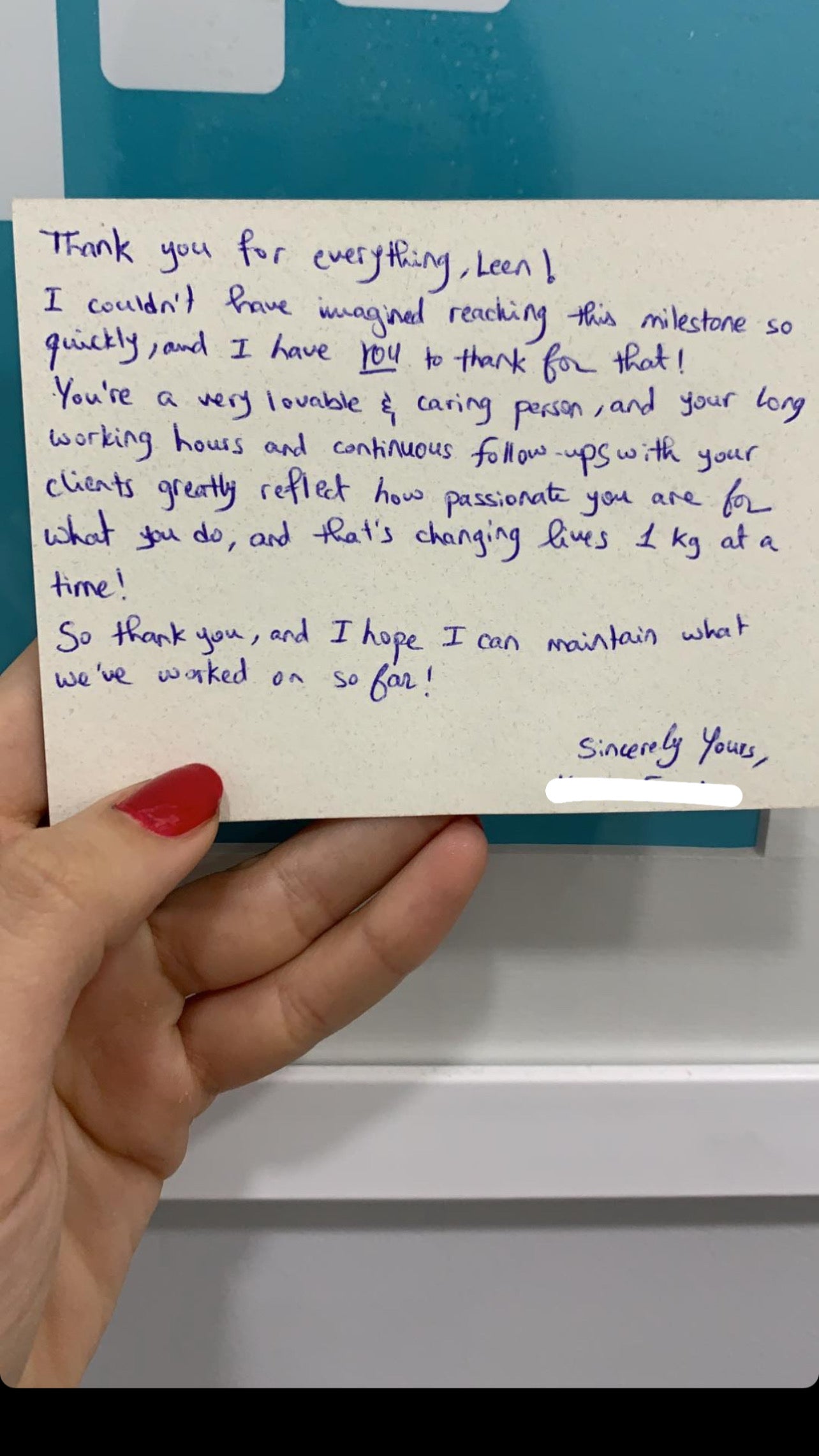 Second: Leen will educate you on the best exercise to reach YOUR goal. Together, you will decide on an exercise regiment that you feel comfortable with. (if you have no time to exercise, Leen will work around that)